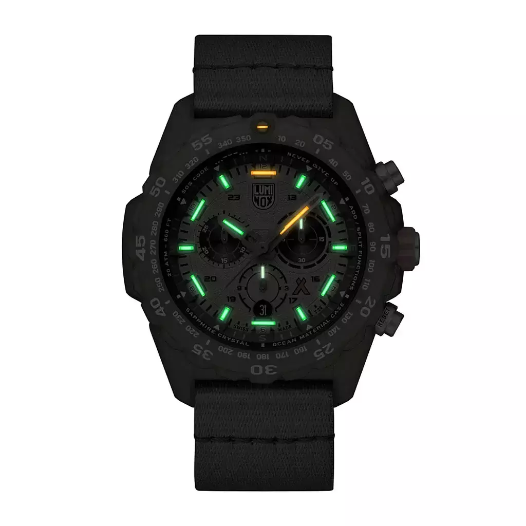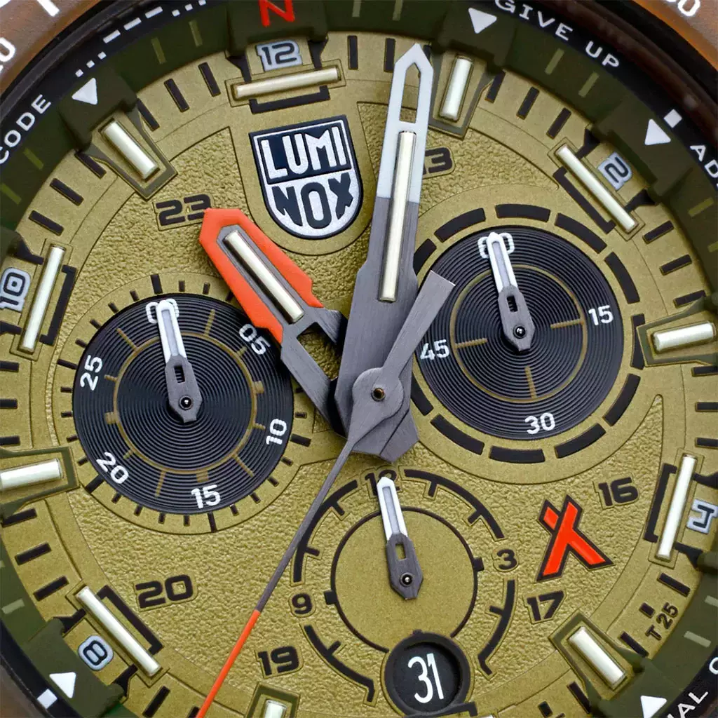 Os materiais oceânicos #TIDE são feitos de plástico 100% oceânico, desenvolvido em parceria com cientistas suíços. Em cinco ilhas no Mar de Andaman, na costa da Tailândia, pescadores locais estão sendo treinados e pagos para coletar e separar resíduos plásticos. Bear Grylls desafiou a Luminox a avançar ainda mais em sua busca pela sustentabilidade, utilizando novo material plástico reciclado para a caixa e a pulseira em parceria com a #TIDE. O material ecologicamente correto oferece durabilidade e resistência à água iguais, essenciais para a aventura, como o CARBONOX™. Este cronógrafo está disponível com mostrador e pulseira verdes. Este relógio sustentável para exterior apresenta o logótipo Luminox, Bear Grylls e #tide no fundo da caixa e é resistente à água até 200 metros.