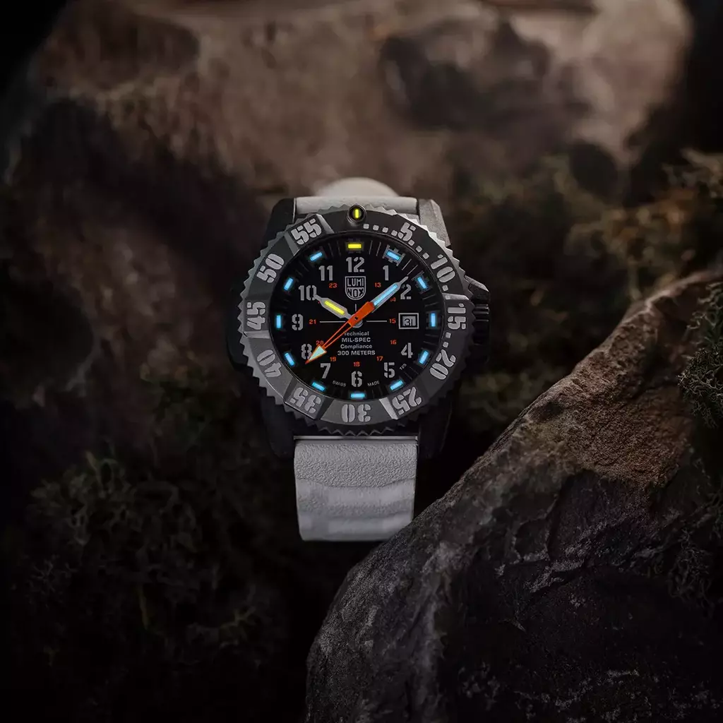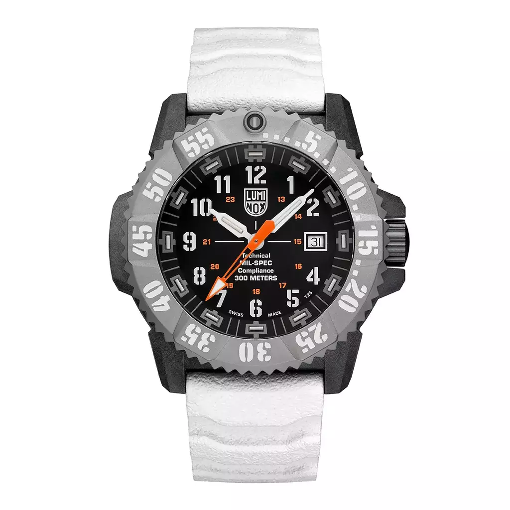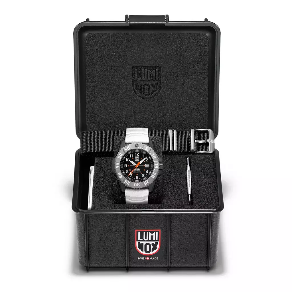 Mil-Spec (abreviação de Military Specification) refere-se ao padrão militar do Departamento de Defesa dos EUA. O XL.3359.SET, com uma caixa leve, porém ultrarresistente, em CARBONOX™+ de 46 mm, aro em titânio grau 2 e resistência à água de 300 metros, atende a esses rigorosos padrões técnicos e prospera nas condições mais difíceis do mundo. No interior, o movimento de quartzo Swiss Made ETA F06.412 com HeavyDrive e PreciDrive garante precisão e confiabilidade, mesmo sob impactos extremos ou mudanças de temperatura. A pulseira branca ousada e as marcações no aro oferecem uma estética pronta para o Ártico, enquanto o grande ponteiro de segundos laranja com ponta de flecha revestida com SuperLumi-Nova, além da Tecnologia de Iluminação Luminox, garantem visibilidade incomparável em todas as condições de iluminação. Acompanhado de uma pulseira preta adicional, este relógio testado em batalha oferece desempenho e versatilidade. Desenvolvido em conformidade técnica com a norma MIL-PRF-46374G Tipo III Classe 1, o XL.3359.SET é confiável por profissionais e desenvolvido para aqueles que nunca desistem.