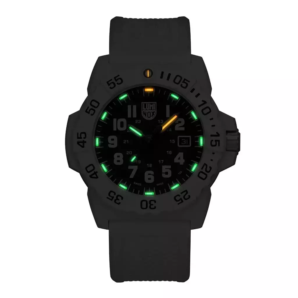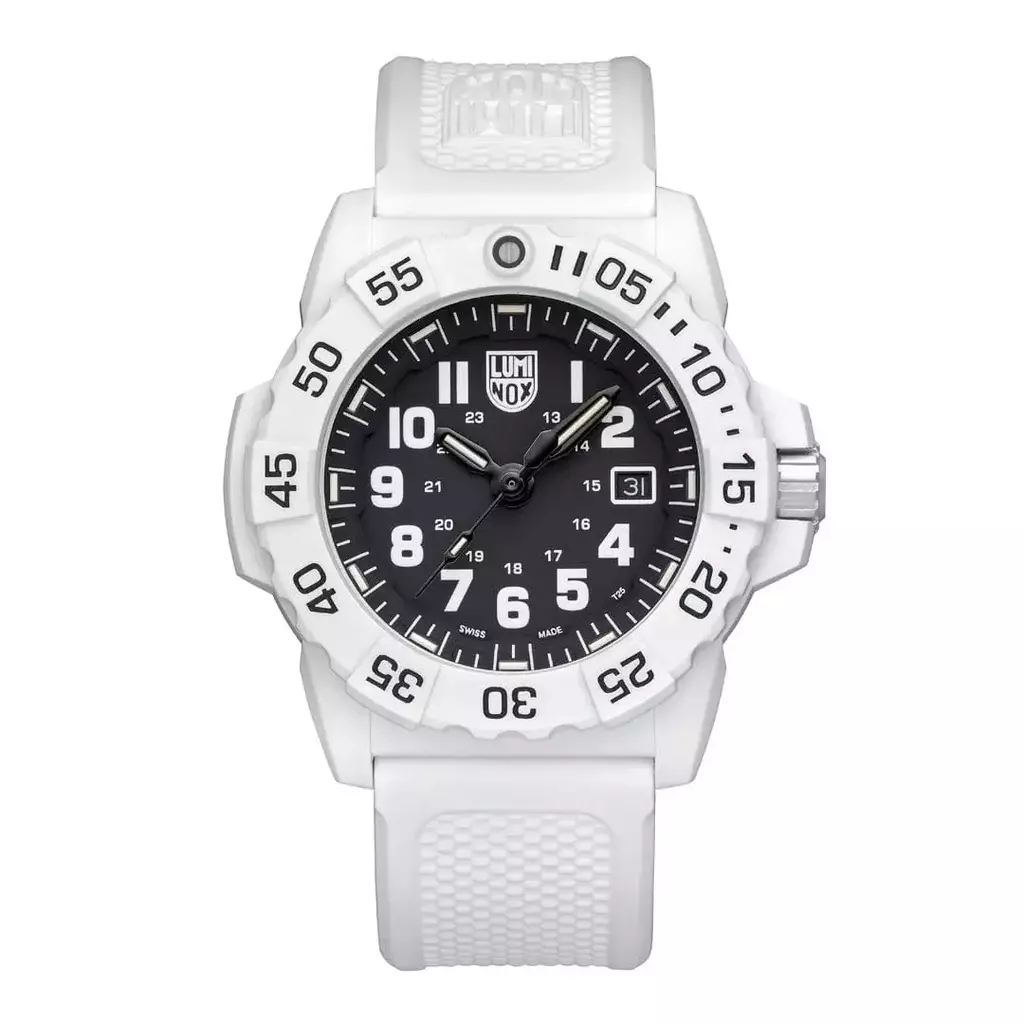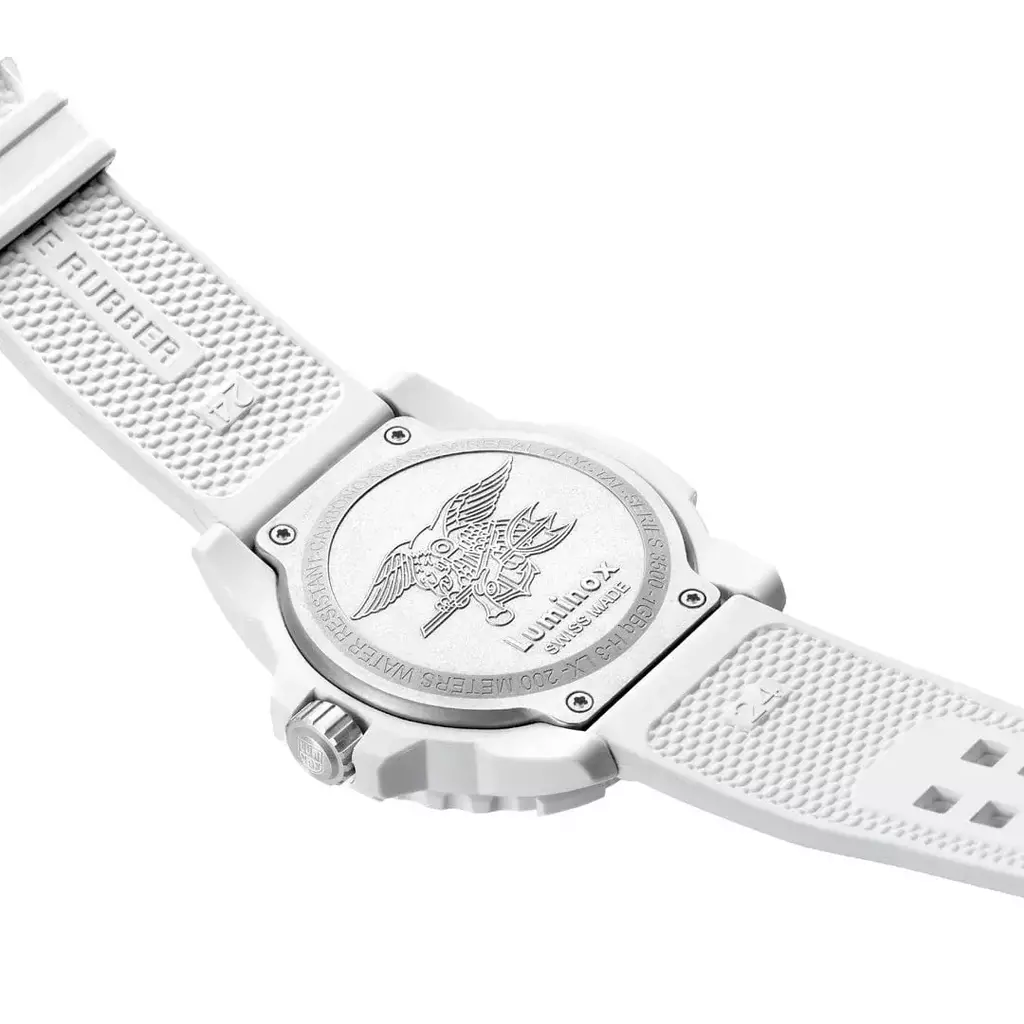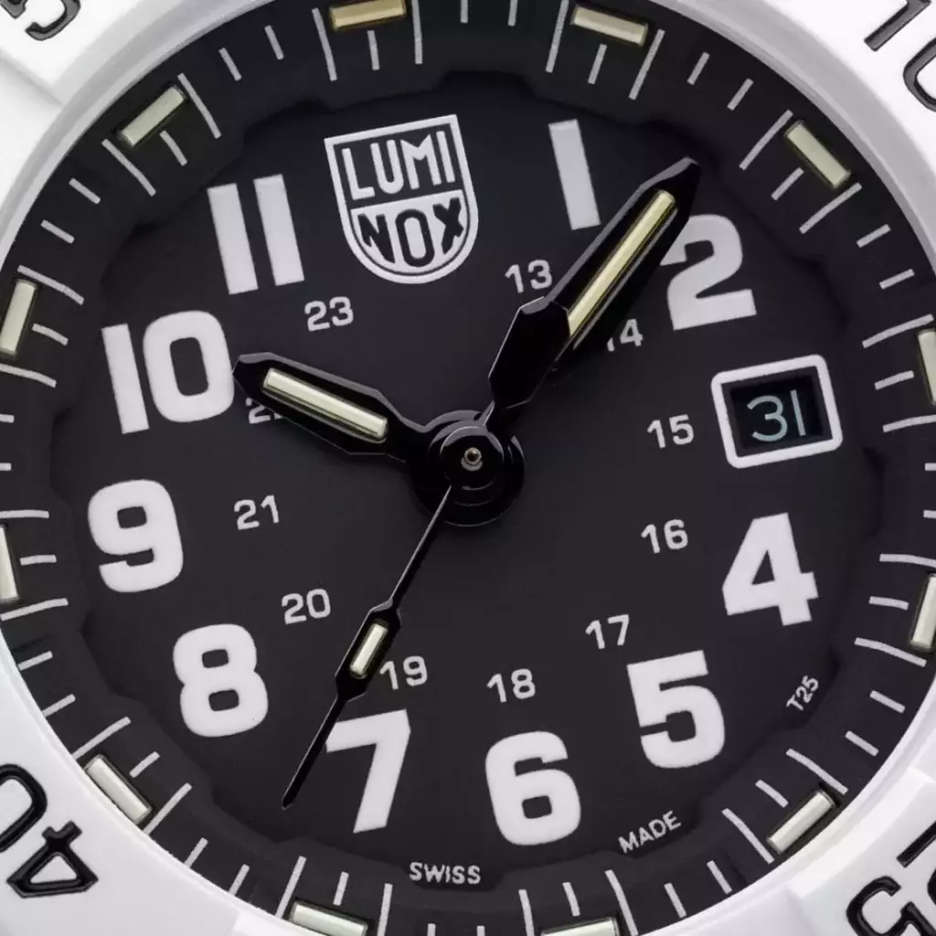 Esta Edição Ártica, um impressionante relógio branco com mostrador preto contrastante, mantém a confiabilidade robusta da icônica Série Navy SEAL 3500. O ousado relógio apresenta uma caixa leve de fibra de vidro branca de 45 mm e um bisel unidirecional, projetado para durabilidade e, ao mesmo tempo, maior discrição em ambientes árticos. O mostrador preto com numerais brancos garante a máxima legibilidade à luz do dia, enquanto a Tecnologia Luminox Light (LLT) oferece visibilidade constante na escuridão total por até 25 anos — essencial para missões em ambientes de baixo contraste. Uma pulseira de borracha genuína branca oferece um ajuste seguro e confortável, enquanto o bisel giratório unidirecional permite o rastreamento preciso do tempo decorrido, tornando-o uma ferramenta essencial para militares e exploradores do Ártico. Seja navegando em terrenos gelados ou enfrentando desafios táticos, o Navy SEAL 3500 – Edição Ártica foi projetado para desempenho máximo nas condições mais exigentes.