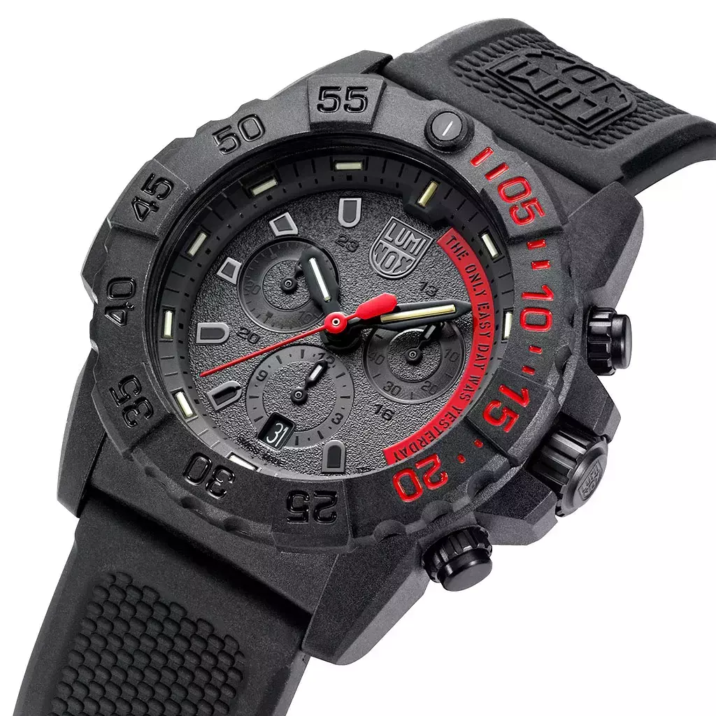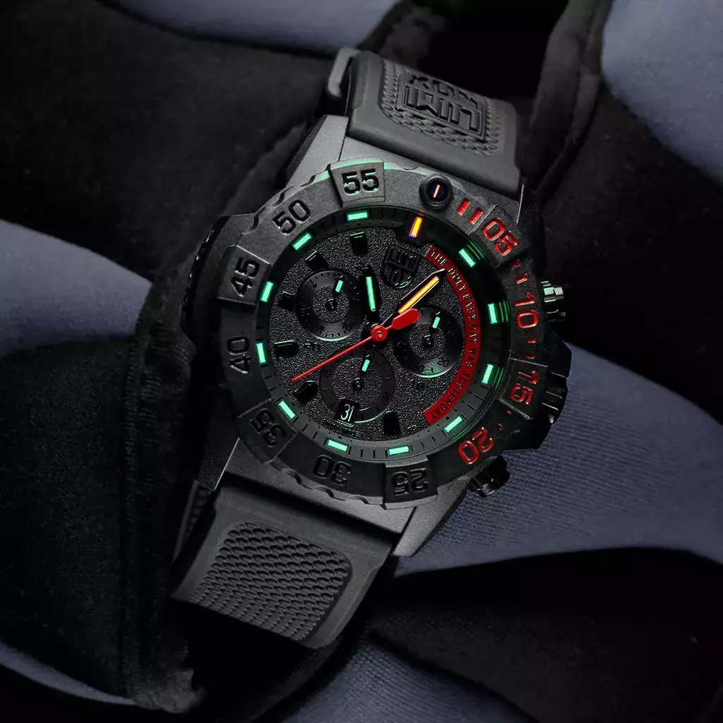 O Luminox Navy SEAL Chronograph impressiona com sua caixa CARBONOX ™ de 45 mm, aro de mergulho e resistência à água de até 200 metros e pode ser usado para mergulho. Melhor legibilidade durante o dia graças às letras brancas sobre fundo preto. À noite, graças ao comprovado sistema de iluminação Luminox Light Technology. “Sempre Visível”, independente de energia, por até 25 anos.