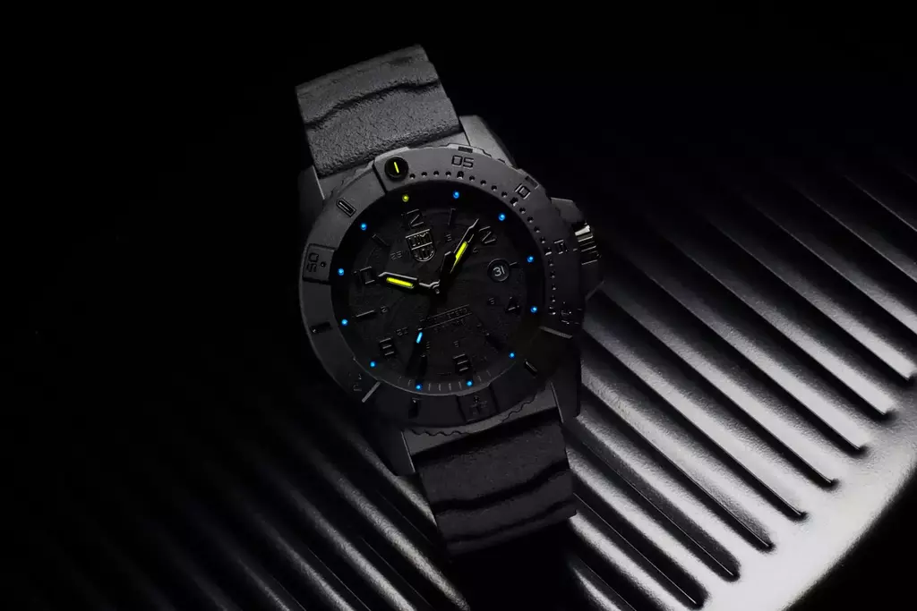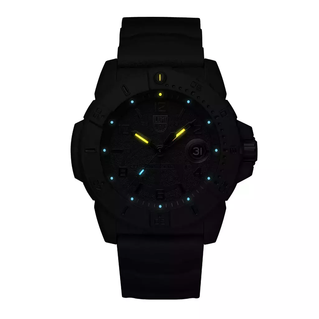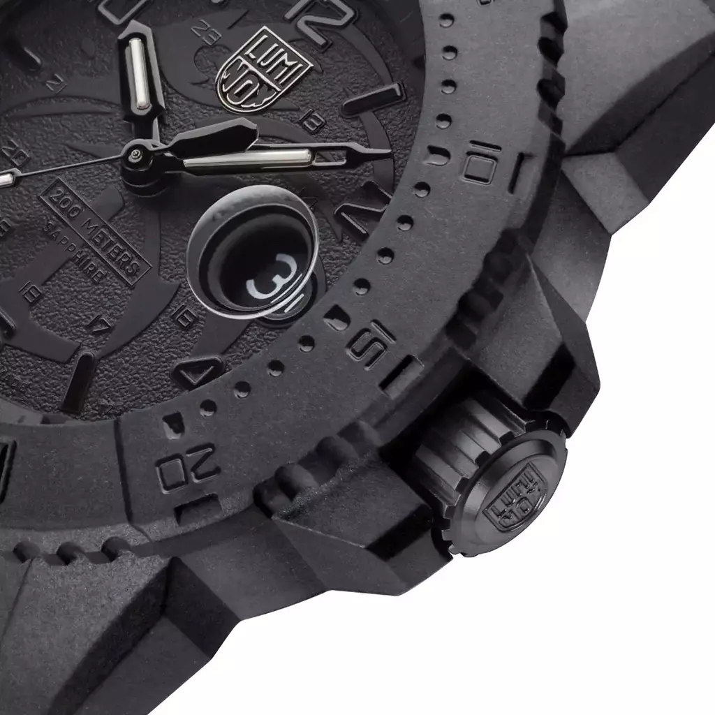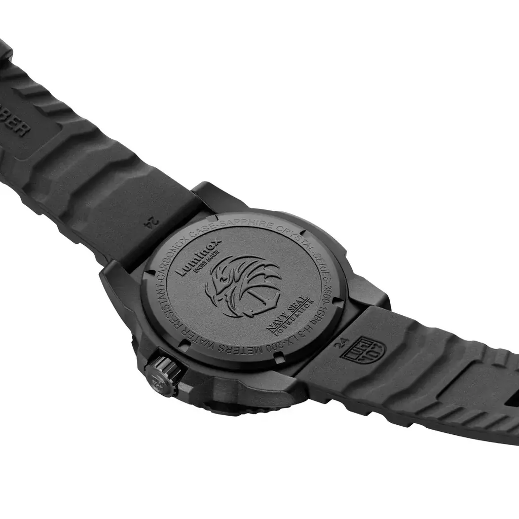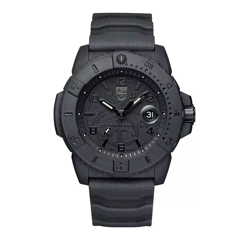 Este relógio Navy SEAL Foundation totalmente blackout contrasta a tecnologia Luminox Light em amarelo e azul gelo e simboliza a luz que a Fundação brilha sobre os veteranos e suas famílias. Este design marcante apresenta o logotipo exclusivo da Navy SEAL Foundation em toda a face do mostrador e no fundo da caixa. Com cristal de safira e caixa, luneta e fecho CARBONOX™ de 45 mm, este relógio foi criado para oferecer durabilidade intensa e é resistente à água até 200 metros.